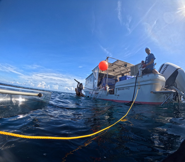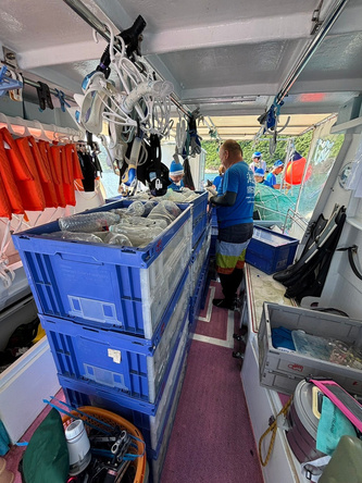 普通のビーチクリーンと違って、泳ぐという過程が入るので熱中症の心配はありませんが、重労働となります。船の上では水分補給とカロリー補給もしながら、皆さんで作業を進めてくださいました。