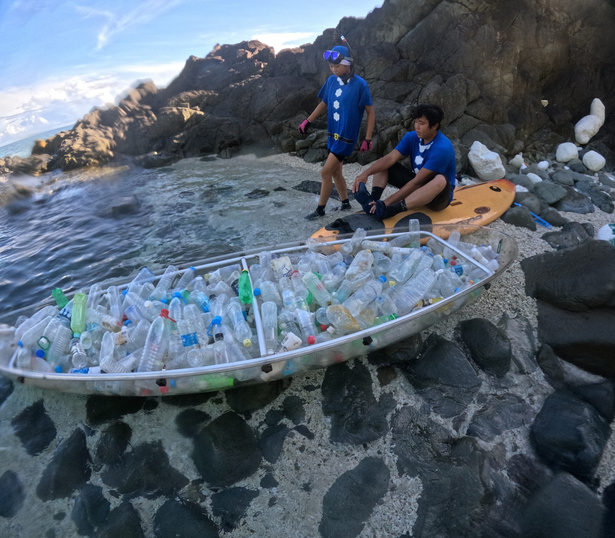 海岸とボートは200mほど離れており、水面にロープを這わすことで往復を楽にする工夫をしました。船の上ではラベルをはがしキャップを取り、潰す作業をして最終処分場へ持って行く下処理班を設置。