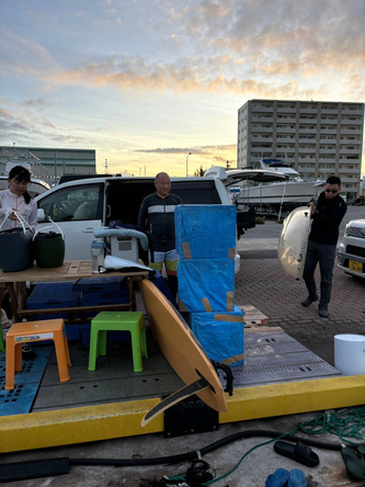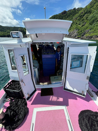 まだまだ拾いきれないペットボトルがありましたが、船がいっぱいになり、90リットルのコンテナ21箱分を乗せて港へ戻りました。石垣市からの漂着ペットボトル用のビニール袋があるとのことなので次回はその袋をもらっておきたいと思います。